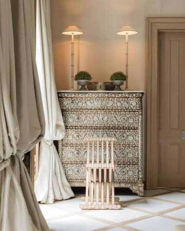 The layered dark- and light-gray hues of the home’s common areas give way to airy shades of white and pale wood in the 560-square-foot master bedroom. The space, which is situated on the house’s second level, incorporates a notable find: a pair of 500-year-old chests of drawers with mother-of-pearl inlay that Hempel acquired in Damascus. “They were very, very dark, and I stripped them blond with an acid,” she says. The drawers served as her muse for the king-size four-poster bed, which she created to match, in American white oak inlaid with mother-of-pearl. The muted-white silk curtains that canopy the bed also suspend from above three French doors, and the marble floor, which the designer describes as “dusty, not shiny,” is inlaid with pine. “It is all very chic and elegant without being flashy,” she says. “I can’t do flash.”