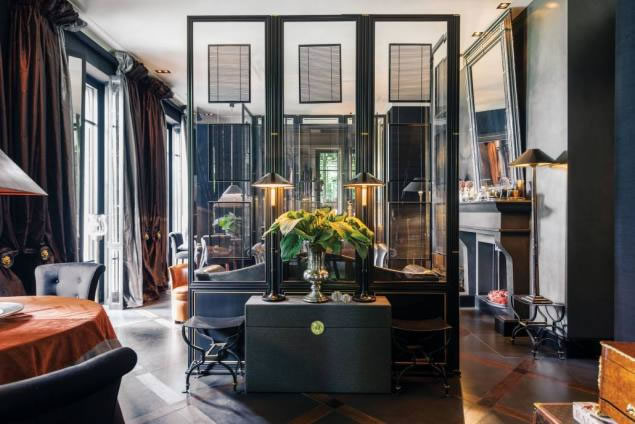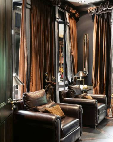 Located directly behind the entrance hall’s slate fireplace is its twin hearth in the 460-square-foot living area. The space’s slate-and-oak floor and mottled trompe l’oeil–style plaster walls, the latter of which were painted by one of Hempel’s in-house artisans, set a neutral stage for the space’s timeless furnishings. A screen of beveled glass and black lacquered wood sets off a sitting area, which benefits from three pairs of French doors. (“She is Swiss-French,” says Hempel of the wife, “so many elements are very French.”) Adorned with the designer’s ceiling-to-floor-length, rust-colored taffeta curtains (the fabric is from the Anouska Hempel Design collection), the doors’ mirrored shutters, which fold back from the panes of glass, reflect sunlight and the mountain views—an old trick Hempel credits to the Venetian people. “They would capture light on the water and send it back into the rather dark and cavernous palaces of that time,” she says. In the study , similar richly hued curtains complement two antique leather club chairs sourced by the home’s owners.