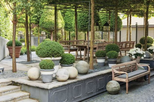 Carefully siting the house on its lot helped to separate the property from a country road. Hempel artfully employed a bi-level terrace framed by walls of lead, stone, and cement; 26-foot-tall hedges; and a trellis overgrown with wisteria. The furnishings on the terrace are all Hempel’s creations, from the steel pendant lanterns over the cement-and-Belgian-stone tables to the teak benches, decorative cement balls, and lead planters.