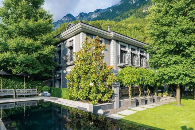 Hempel obliged, and she and her namesake London firm then spent more than two years on the architecture, landscaping, and interior design, the latter of which entailed creating most of the home’s custom furnishings. Ultimately, the team translated the husband and wife’s affinity for Hempel’s eclectic style (think Blakes, where every room is unique and accented by pieces from her far-flung travels) into an 11,200-square-foot house, on a 13,400-square-foot lot, that stands tall against a backdrop of the central Alps.