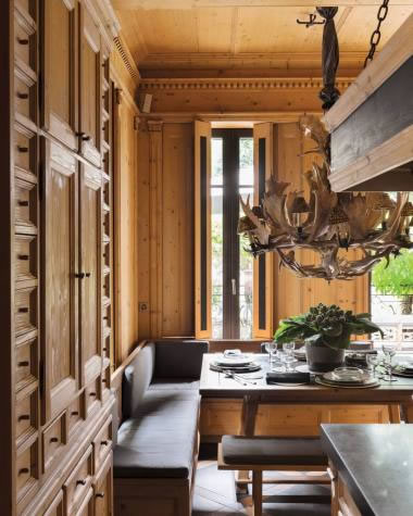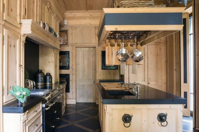 In the kitchen and its dining area, which Hempel describes as “Swiss-Austrian,” wildlife-themed accents lend an air of whimsy. The antique chandelier that hangs above the slate-and-pine dining table bears moose antlers and feather lamp shades. At the end of the custom granite-topped island, dish towels can be slung through the nose rings on two iron bull heads. The designer chose the towel rings from a collection of antique fittings that she has amassed during her travels over the years.