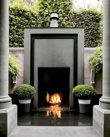 The property’s wood-burning outdoor fireplace is prominently placed opposite the home’s main entrance. Like the two fireplaces inside, it is fronted by a segment of sandblasted slate flooring that has been polished “to look like an oil slick” reflecting the fire’s glow. “It’s like what the Romans used to have: You got out of your carriage and were warmed up by a fire usually in the walls, wherever you were,” says Hempel. “It’s part of being a great romantic. I pick up things from everywhere and try to bring them into other people’s lives.”