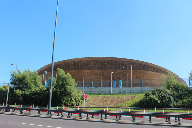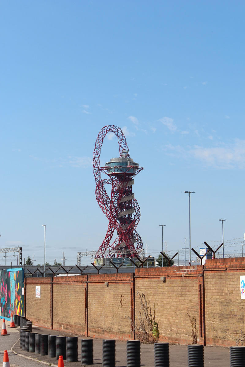 On a summery day, sitting on the back of the Harley, we ventured to Stratford and the Olympic Village, and reached the central Olympic reservations which were still quiet at the week-end, as access to Stratford is getting ever-more limited and secure with large high steel fences surrounding the inner sporting sanctum. Over the tops of the enclosure, just in sight, are Zaha Hadid’s quite beautiful London Aquatics Centre, and Anish Kapoor’s £19m red iron Orbit Tower installation, which sends public art into the skies…with a restaurant on the top!